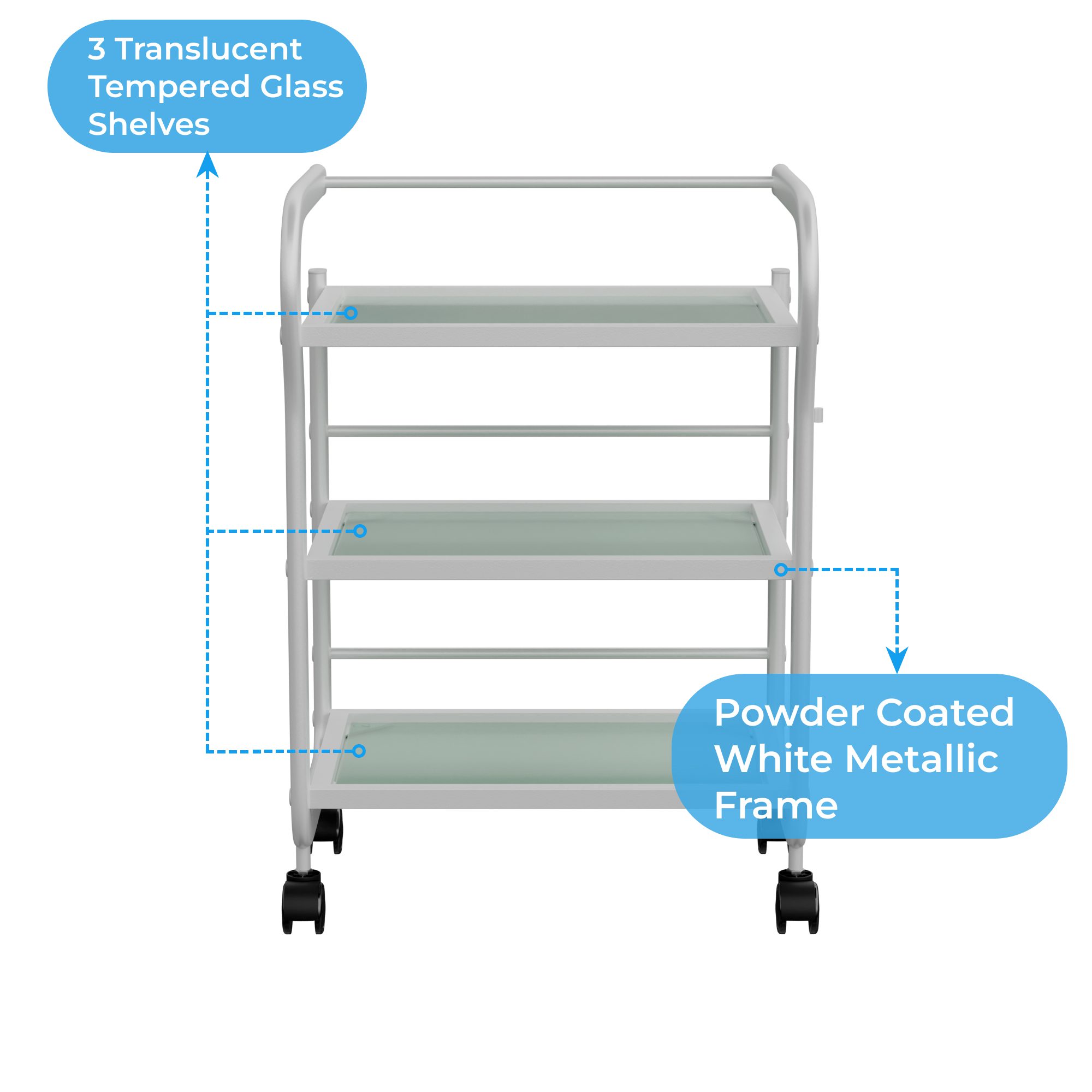 Spa Numa ARCUS Beauty Trolley - White Metallic Design with 3 Tempered Glass Shelves | Salon Organizer Cart for Beauty Products, Tools, and Equipment | Mobile Rolling Storage with Rails - USA-1013