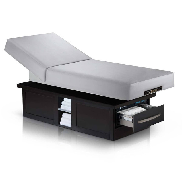 Elegant, Multifunctional Design: The Everest Eclipse distinguishes itself with a sophisticated cabinet base, providing plenty of storage with two end drawers. One or both drawers can be upgraded to a warming drawer, ideal for heating towels or stones, enhancing your client’s experience. This unique feature maximizes convenience for therapists by ensuring essentials are within arm’s reach.