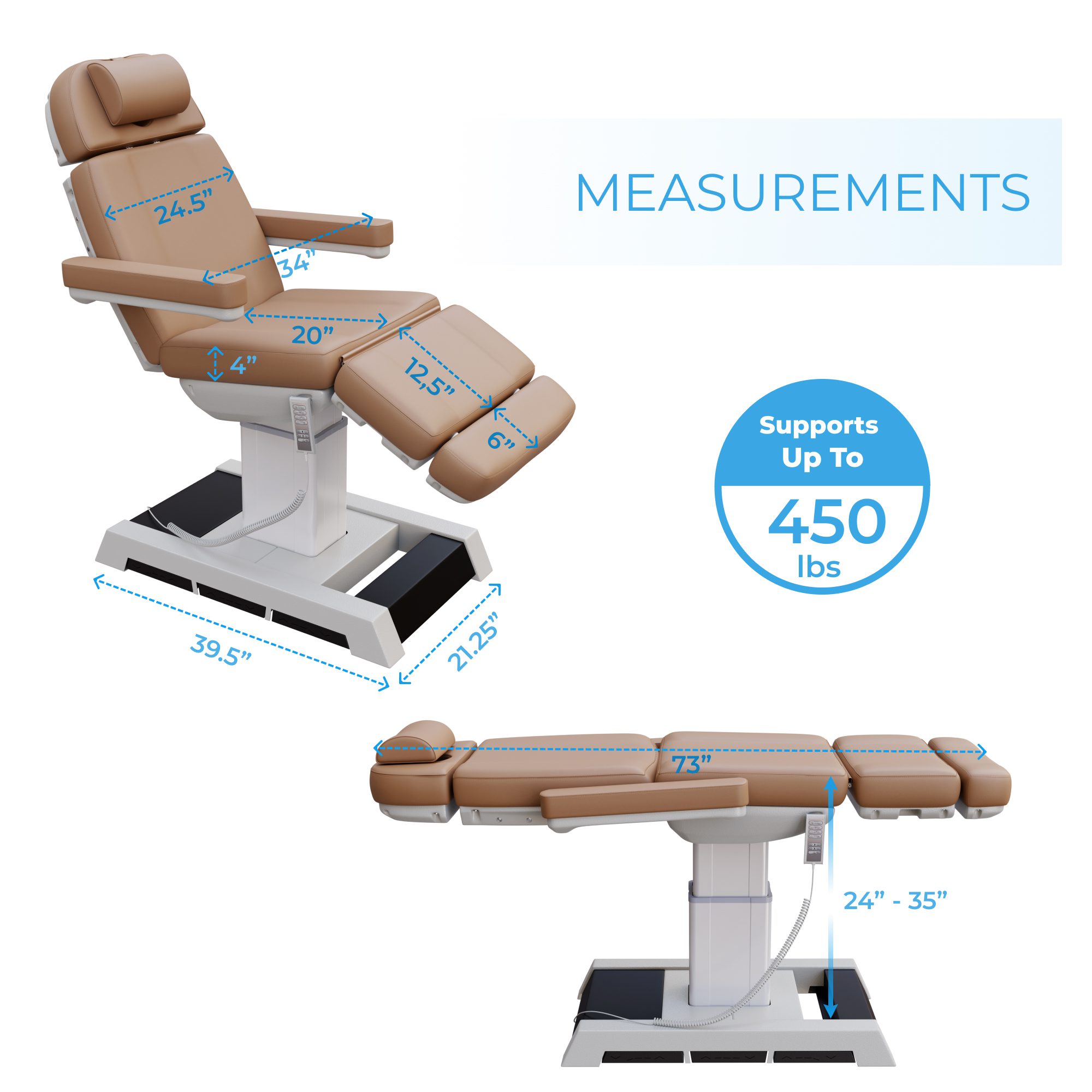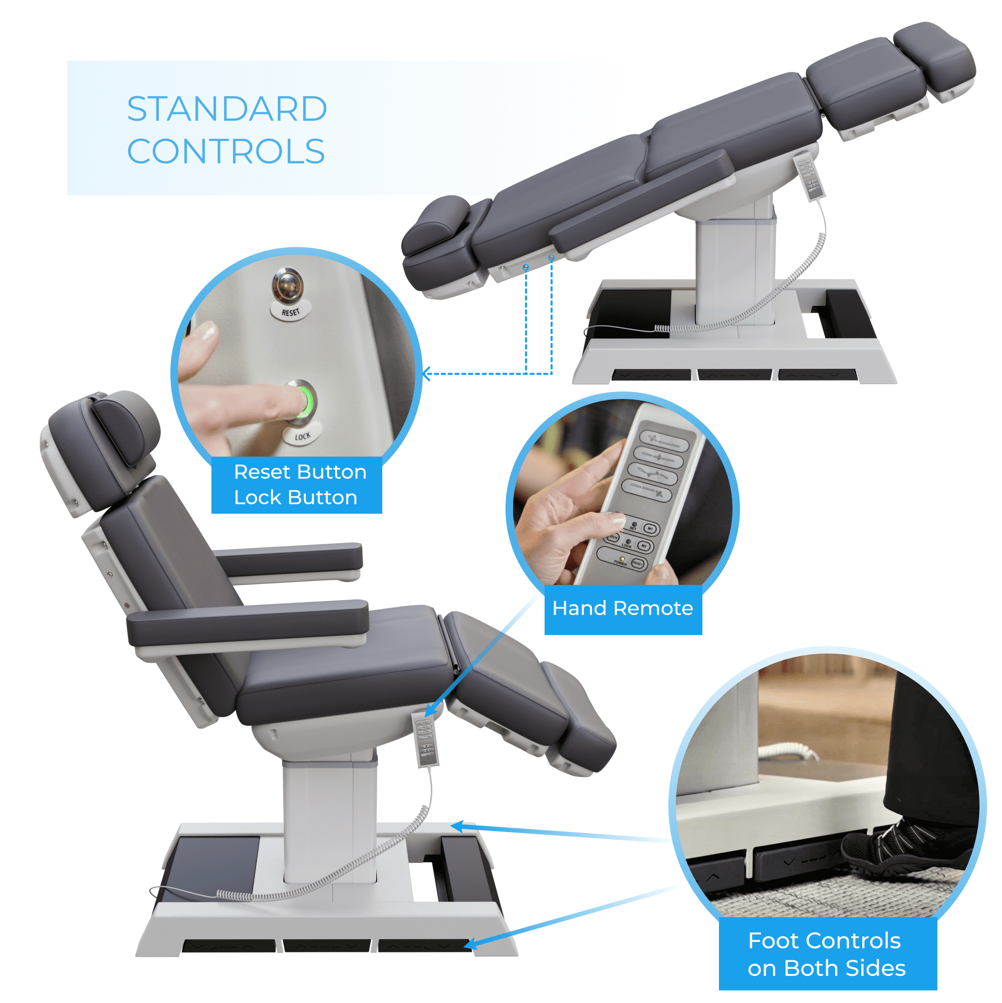 The MEDICI is a heavy duty, medical grade, treatment chair. It is ideal for any office that prefers a wider seating space and a higher weight capacity. This treatment bed is in high demand from many offices, like out-patient surgery centers, that perform long procedures. The Medici features 4 motors to control the height, backrest, footrest, and chair tilt.