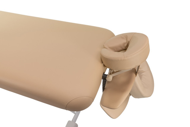 Adjusting table height is a breeze, with its sturdy steel frame and heavy-duty polypropylene wheels. The table’s ergonomic adjustable face rest and arm shelf further cater to client comfort, especially for those with neck issues.