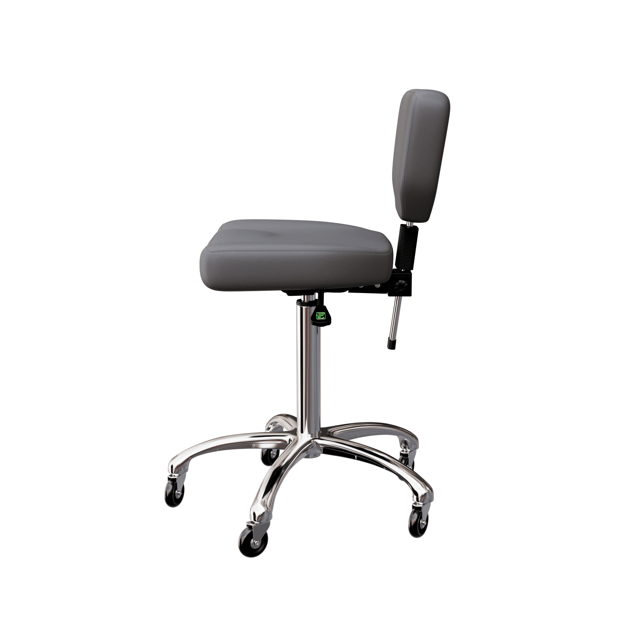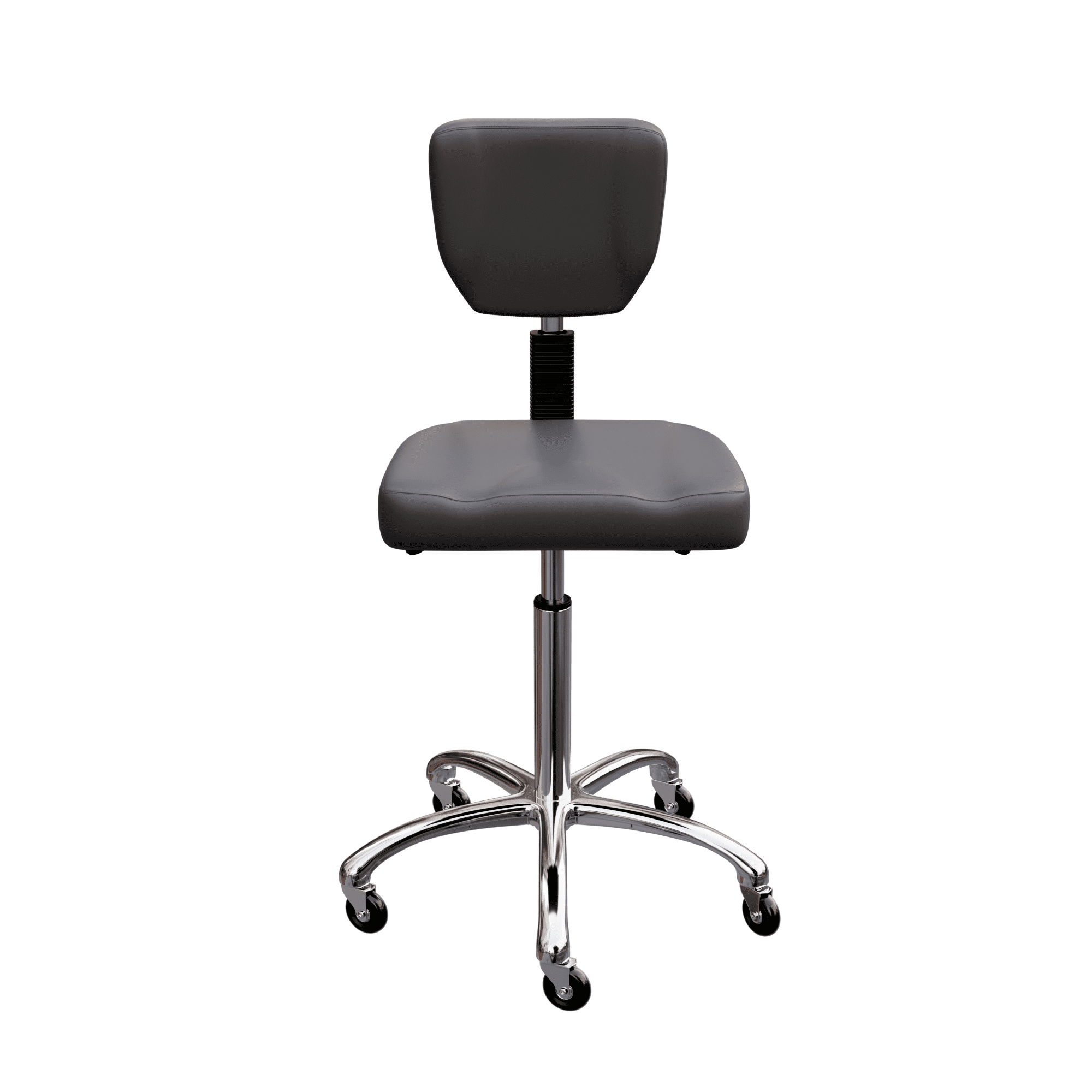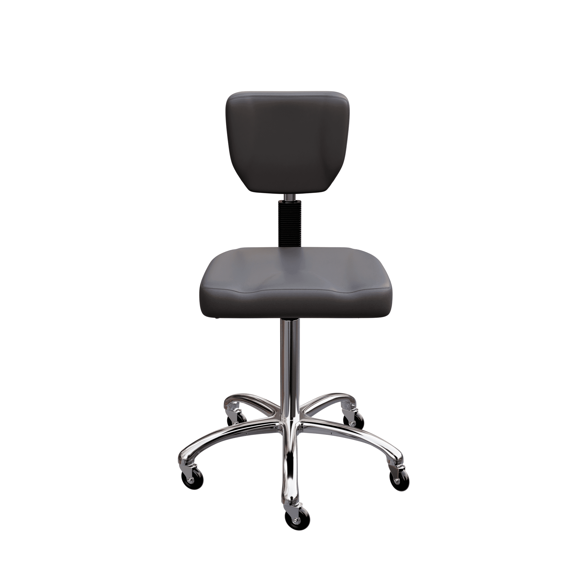 This is an elegant stool with a sturdy seat and backrest. It is equipped with 3 gas lift levers to adjust height, backrest and tilt. It comes with a highly stable 5-wheel chrome base and its high-grade polyurethane upholstery makes it easy to clean with warm water.