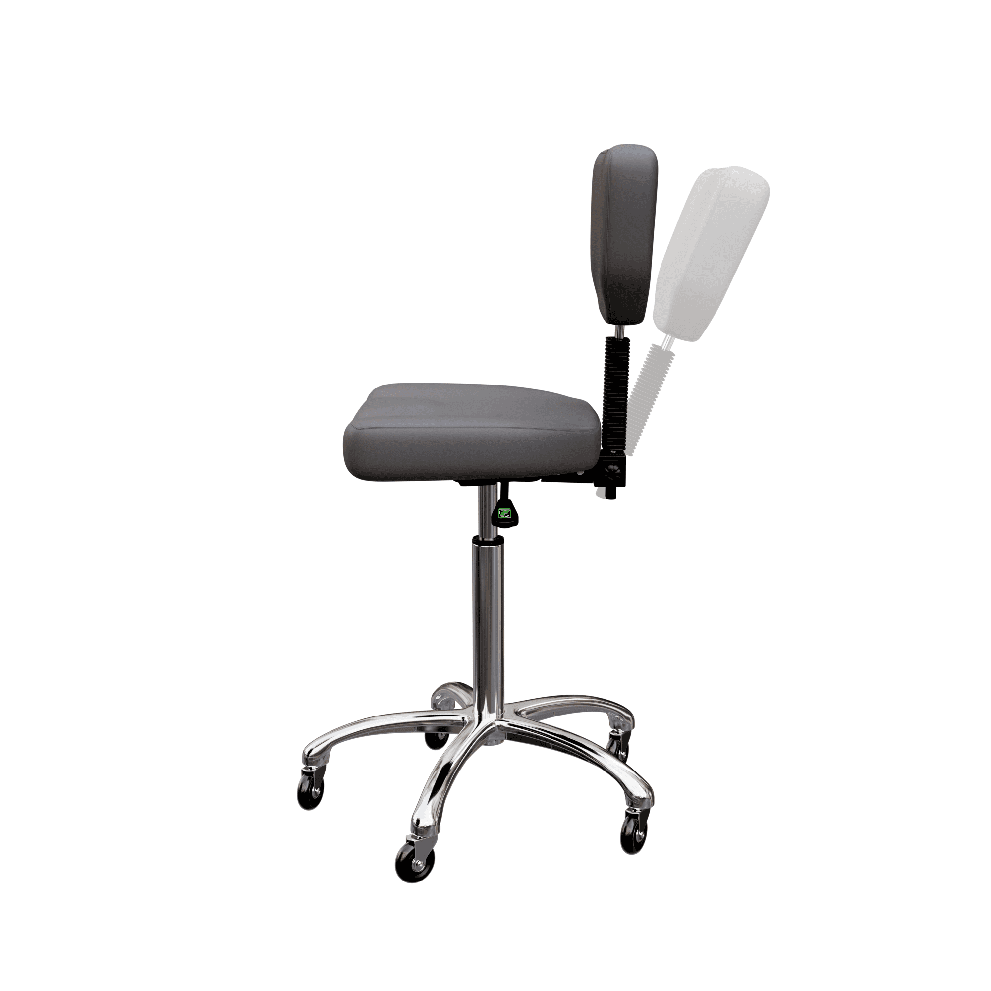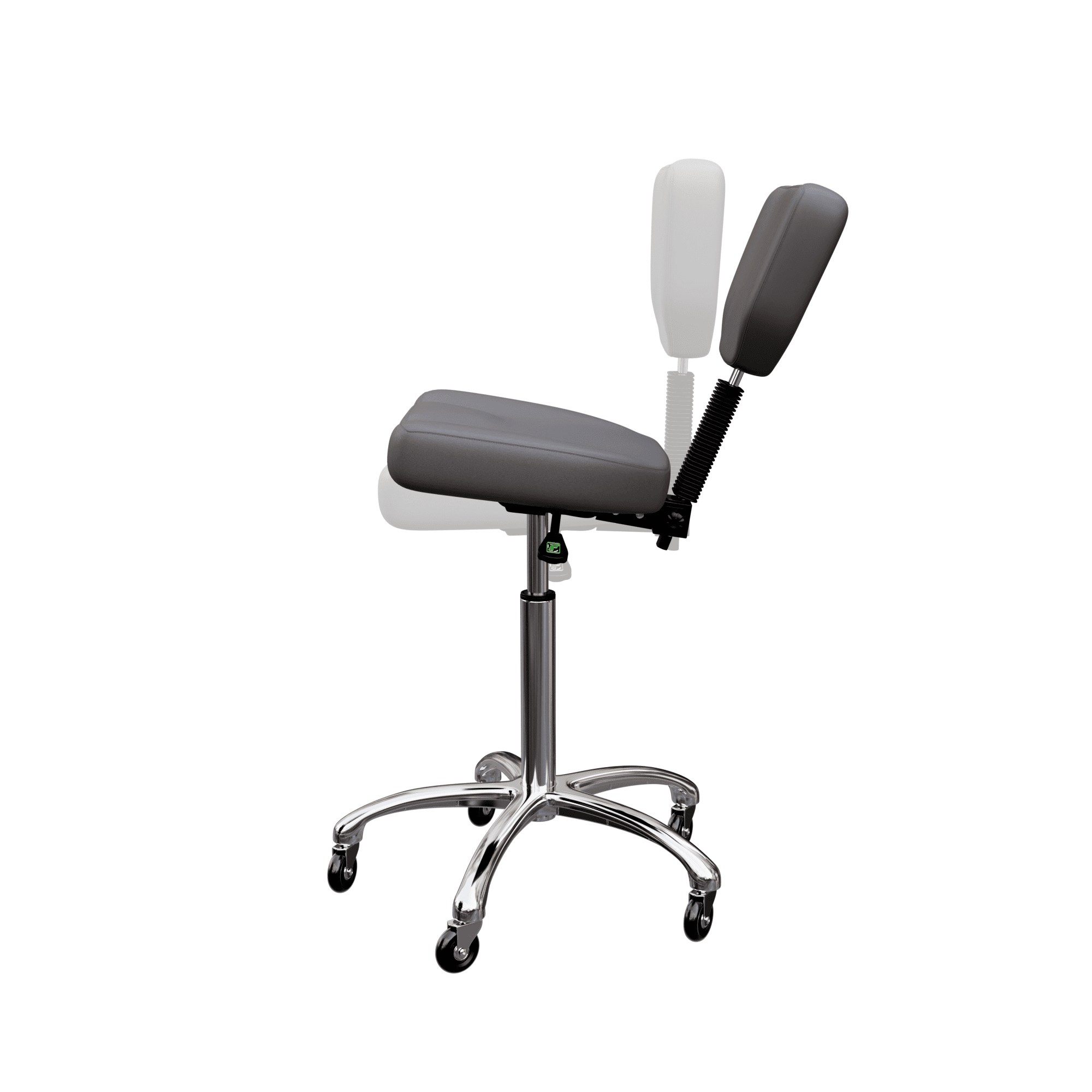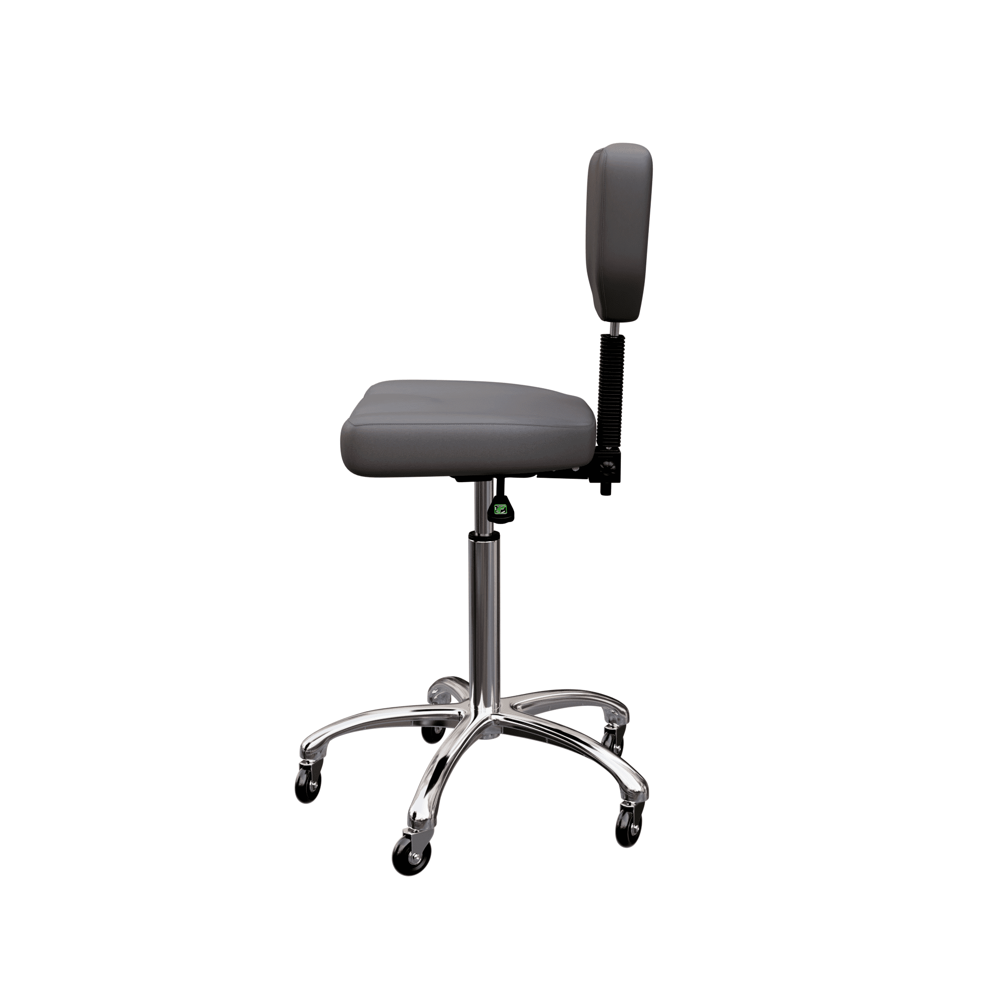 This is an elegant stool with a sturdy seat and backrest. It is equipped with 3 gas lift levers to adjust height, backrest and tilt. It comes with a highly stable 5-wheel chrome base and its high-grade polyurethane upholstery makes it easy to clean with warm water.