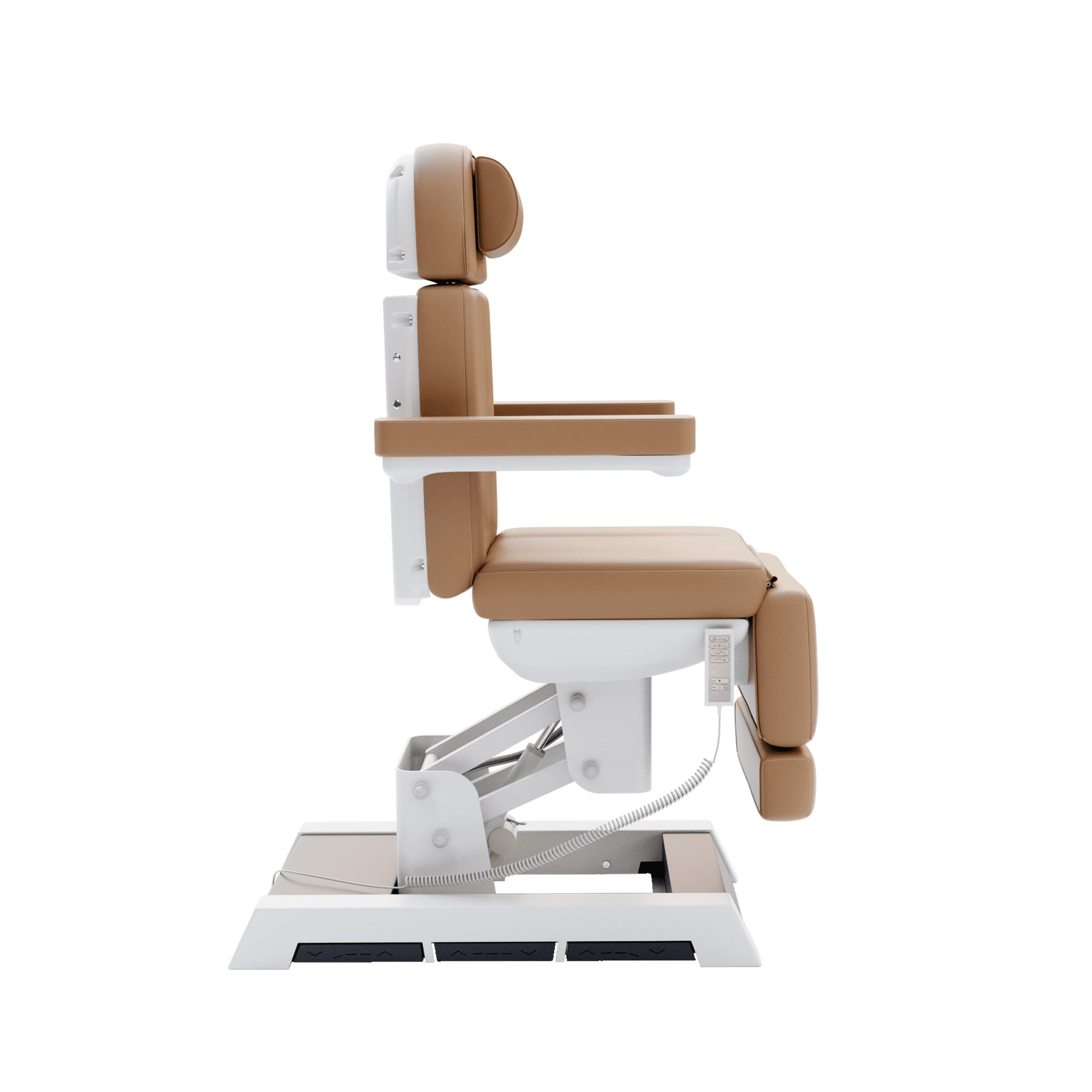 The built-in foot pedal controls are located at the base on both sides, and they control the height, backrest and footrest.