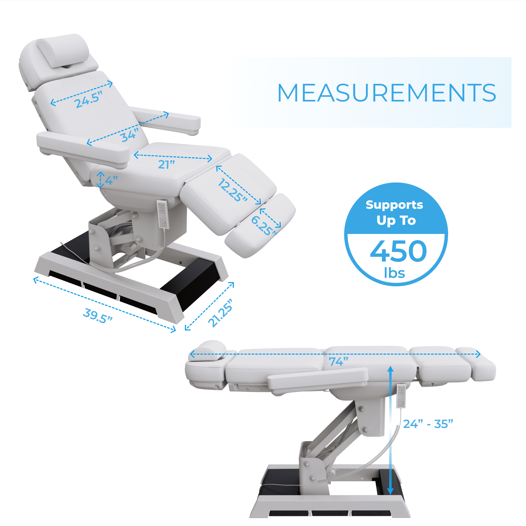 This Heavy-duty treatment bed/chair comes with 4 motors that control: