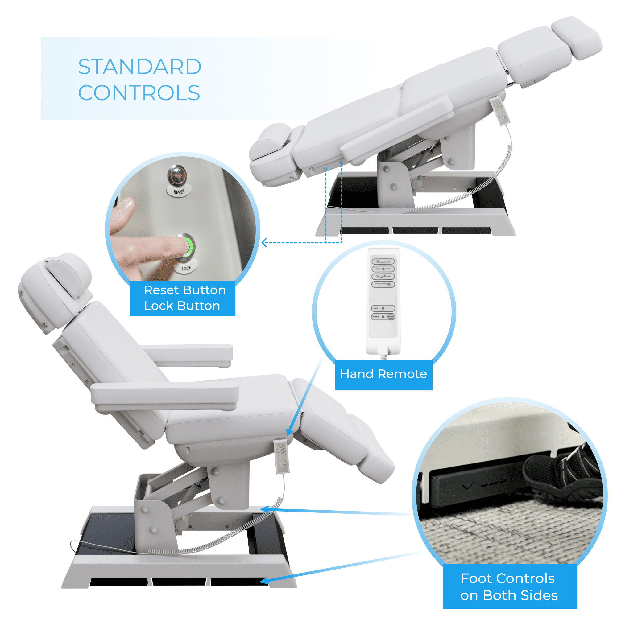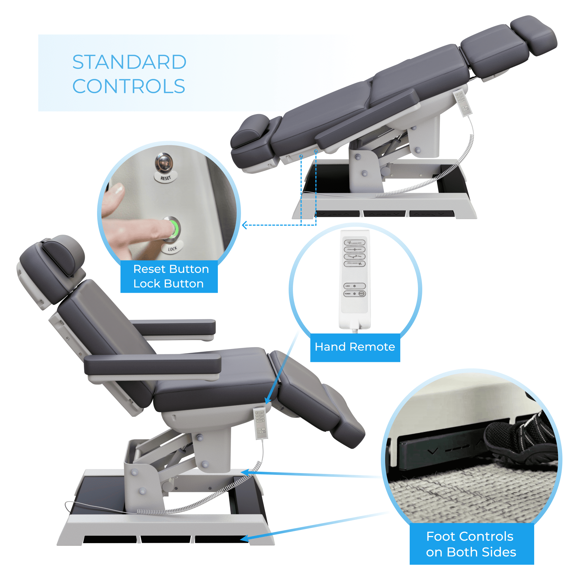 - Built-in foot pedals allow control for 3 functions from both sides of the chair