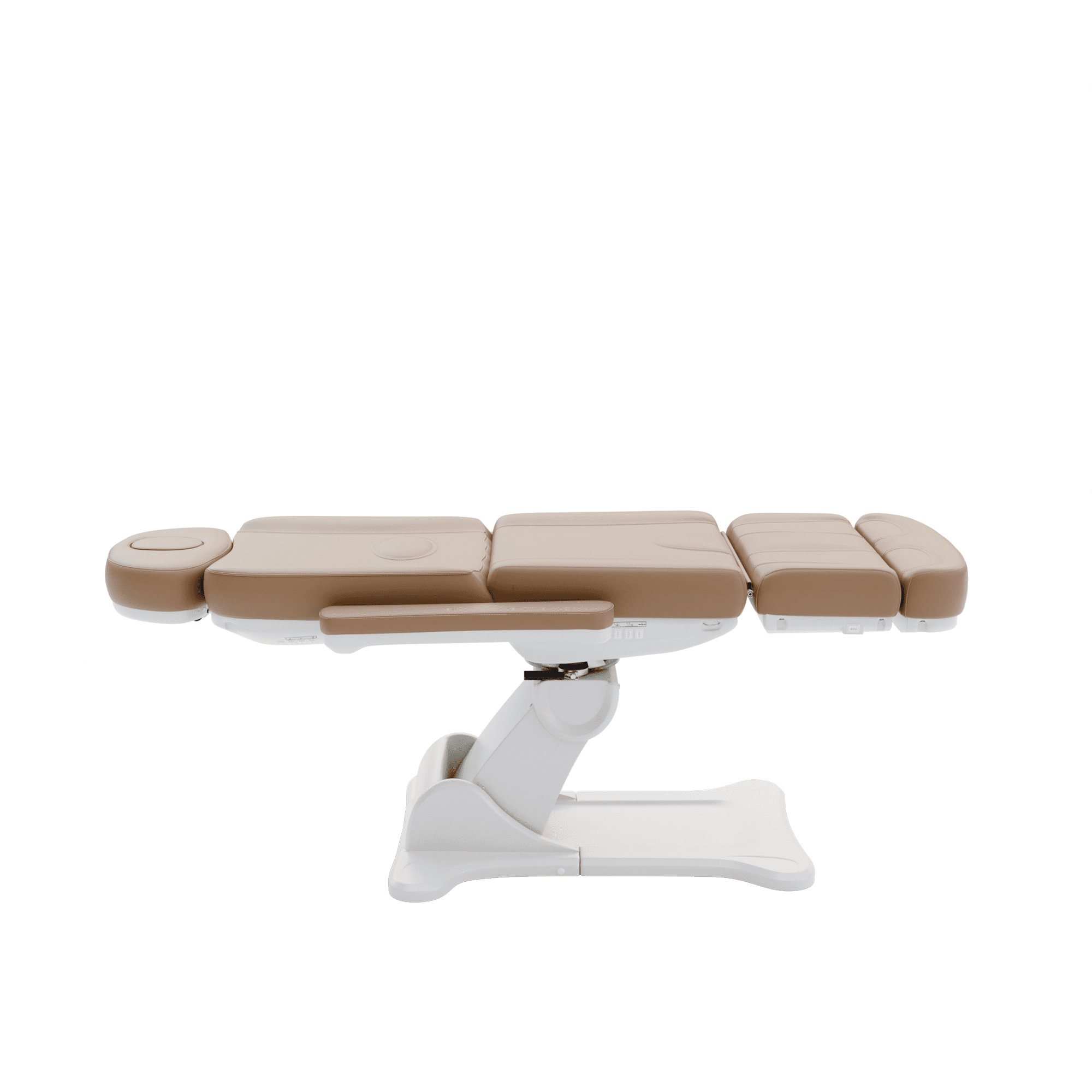 The bed can sit at a 90° angle and can also lay flat. The armrests are reversible and the headrest can be extended. The headrest also has a removable cushion that reveals a facial hole. The bed itself can be lowered very close to the floor and can rotate 240°.